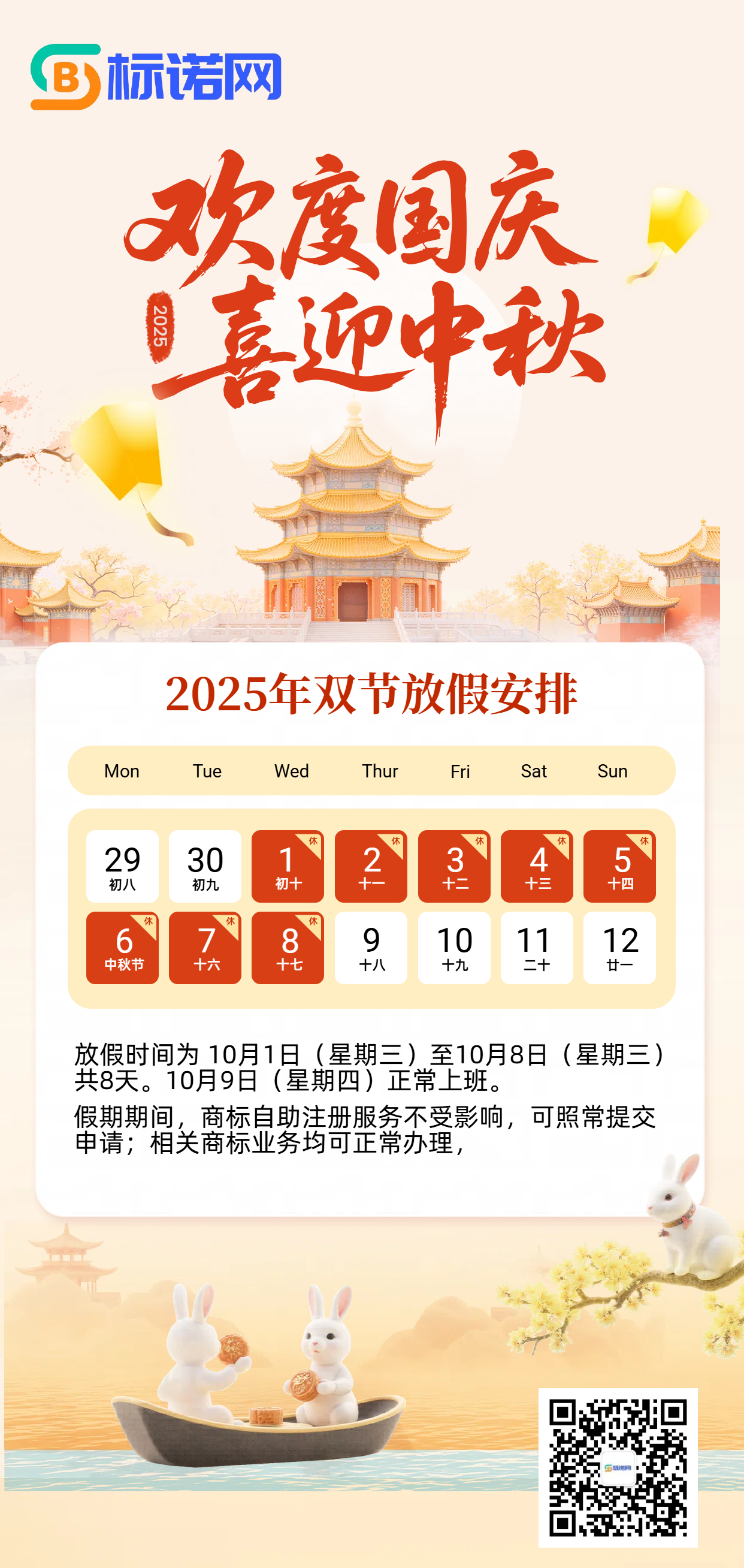 您好!2025年国庆节及中秋佳节将至,根据《国务院办公厅关于2025年部分节假日安排的通知》,结合我司实际情况,现将放假及调休安排公布如下: