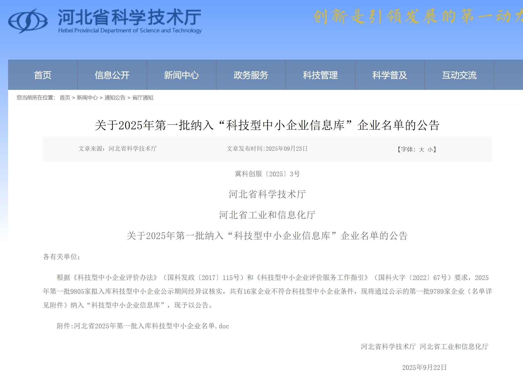 2025年9月22日,河北省科学技术厅与河北省工业和信息化厅对外发布公告,确认9789家企业成功纳入2025年第一批科技型中小企业信息库。此次评定依据国家相关办法和指引,经过审核、公示与异议核实,最终形成入库名单。