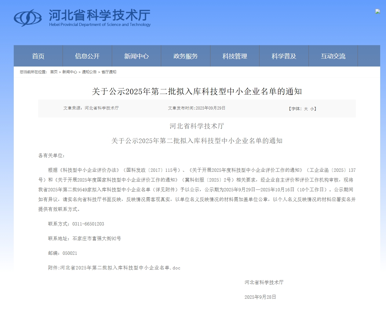 9月29日,河北省科学技术厅发布通知,公示了2025年第二批拟入库科技型中小企业名单,共计 9549家企业 入选。公示期自2025年9月29日至10月16日。
