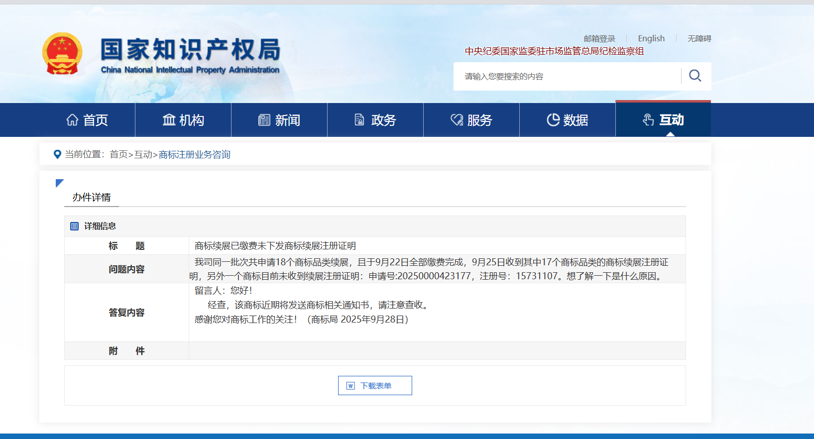问题描述:某公司在同一批次申请了18个商标品类的续展,并于2025年9月22日完成了所有商标的缴费。然而,尽管其中17个商标的续展注册证明已在2025年9月25日收到,另一个商标(申请号:20250000423177,注册号:15731107)的续展注册证明却迟迟未发放。对此,申请人感到困惑,想了解具体原因。