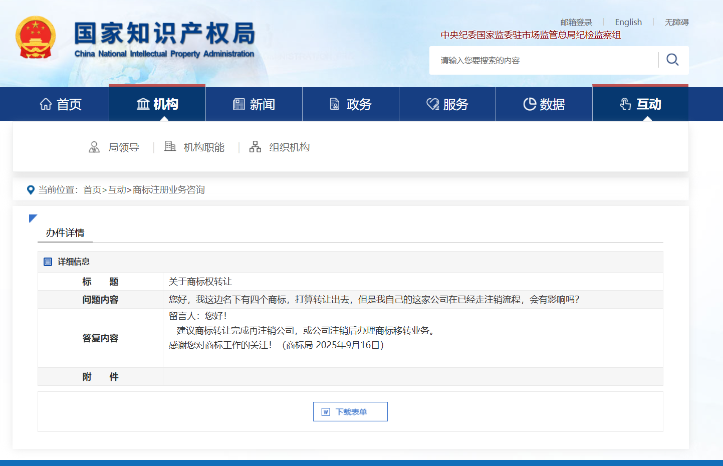 商标局答复:商标局的建议是:建议在公司注销前完成商标转让,或者在公司注销后再办理商标移转业务。