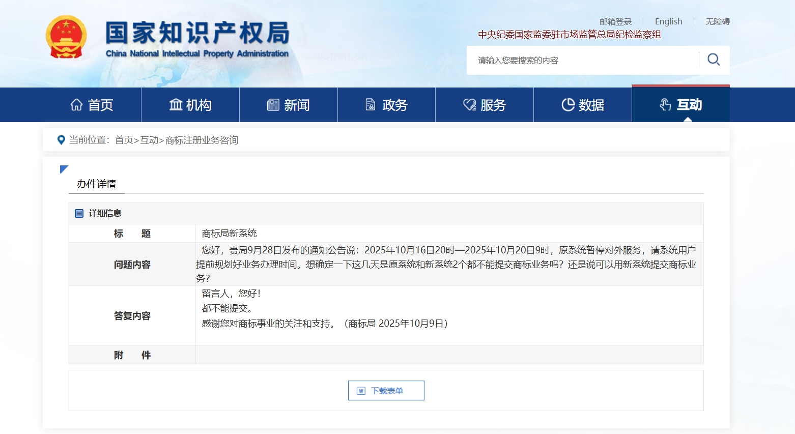 “您好!10月16日至10月20日期间,原系统和新系统均不能提交商标业务。感谢您对商标事业的关注和支持。”