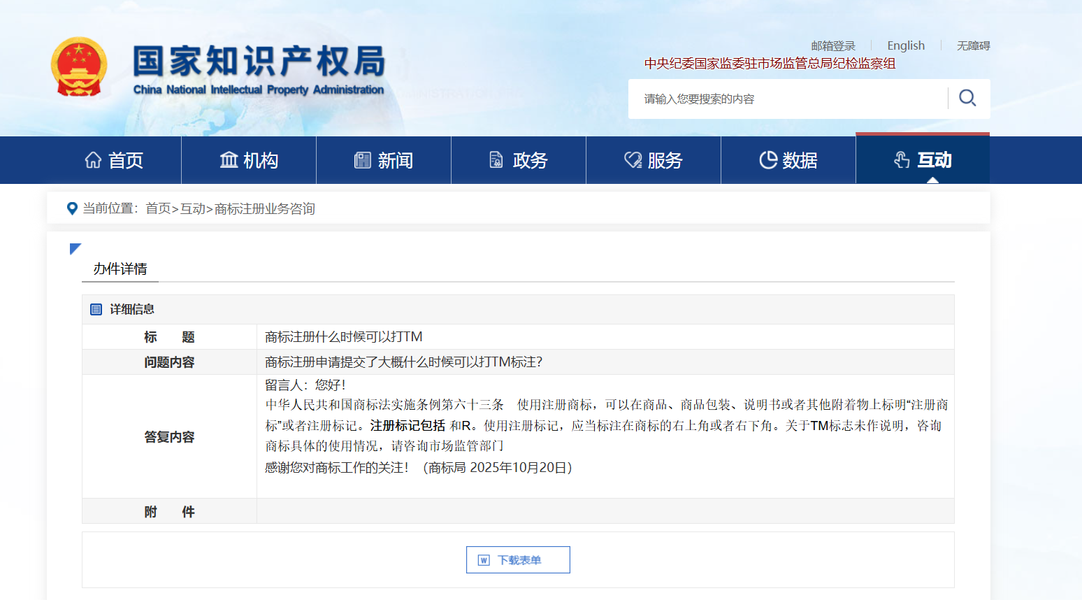 对此,国家知识产权局商标局在2025年10月20日的官方留言答复中表示: