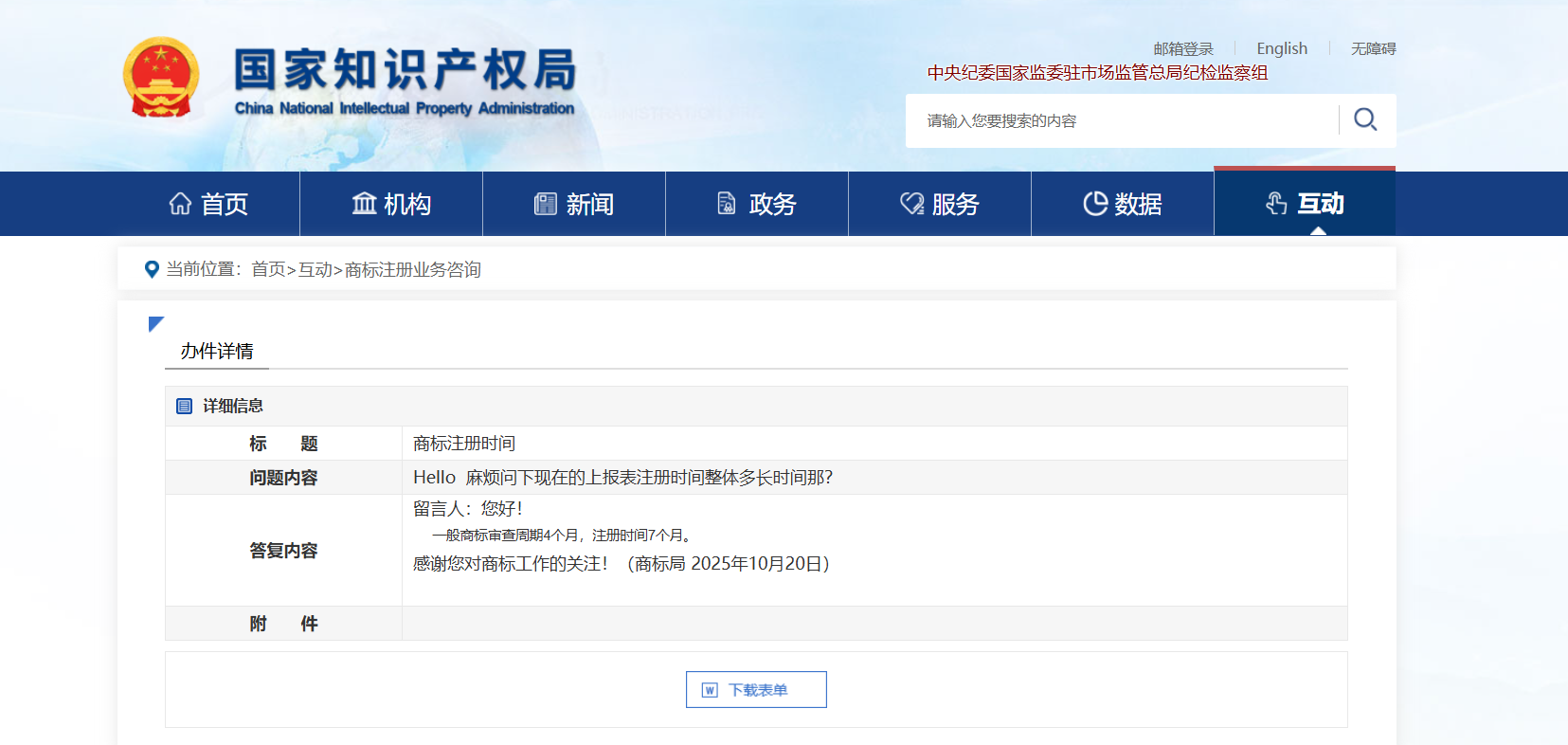 对此,国家知识产权局商标局在2025年10月20日的官方留言中明确回复:
