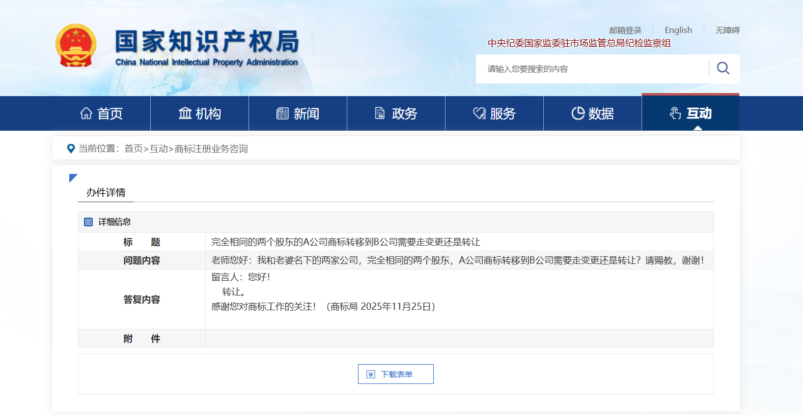 A公司和B公司股东完全一致,商标从A公司转到B公司,到底算“变更”还是“转让”?