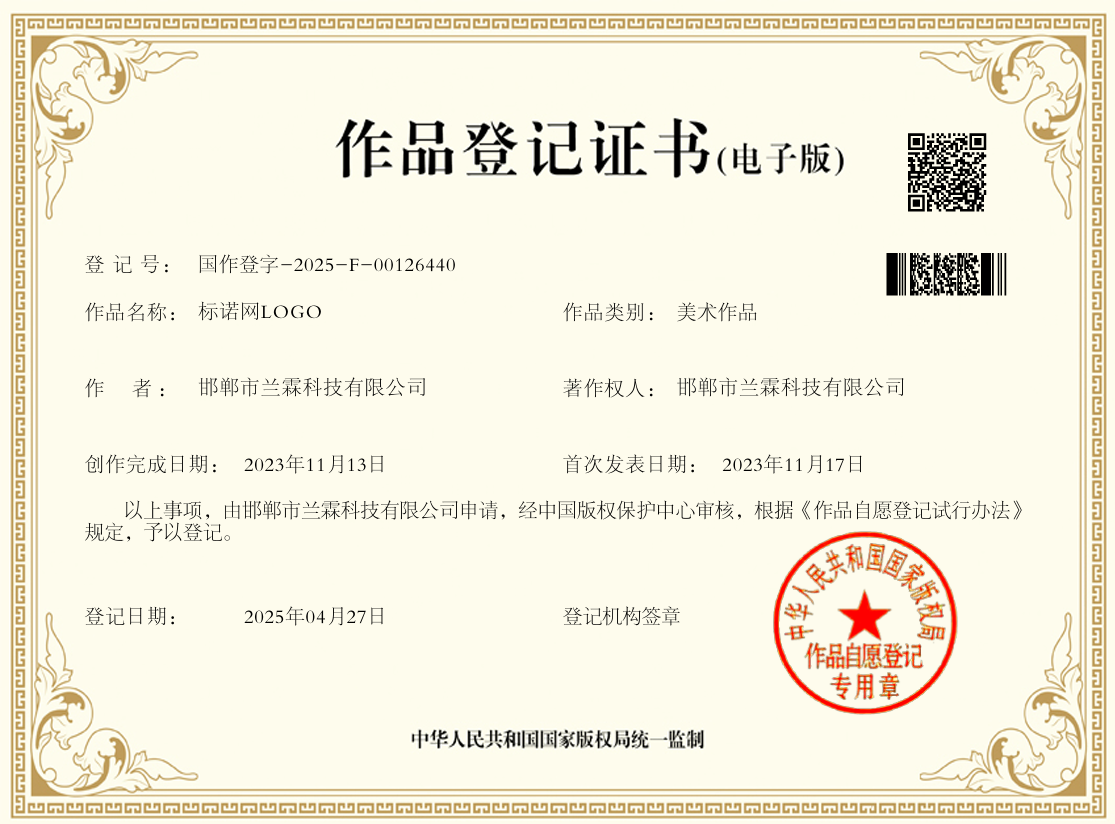 标诺网LOGO作品,早在此前已完成版权登记,并取得《作品登记证书》。